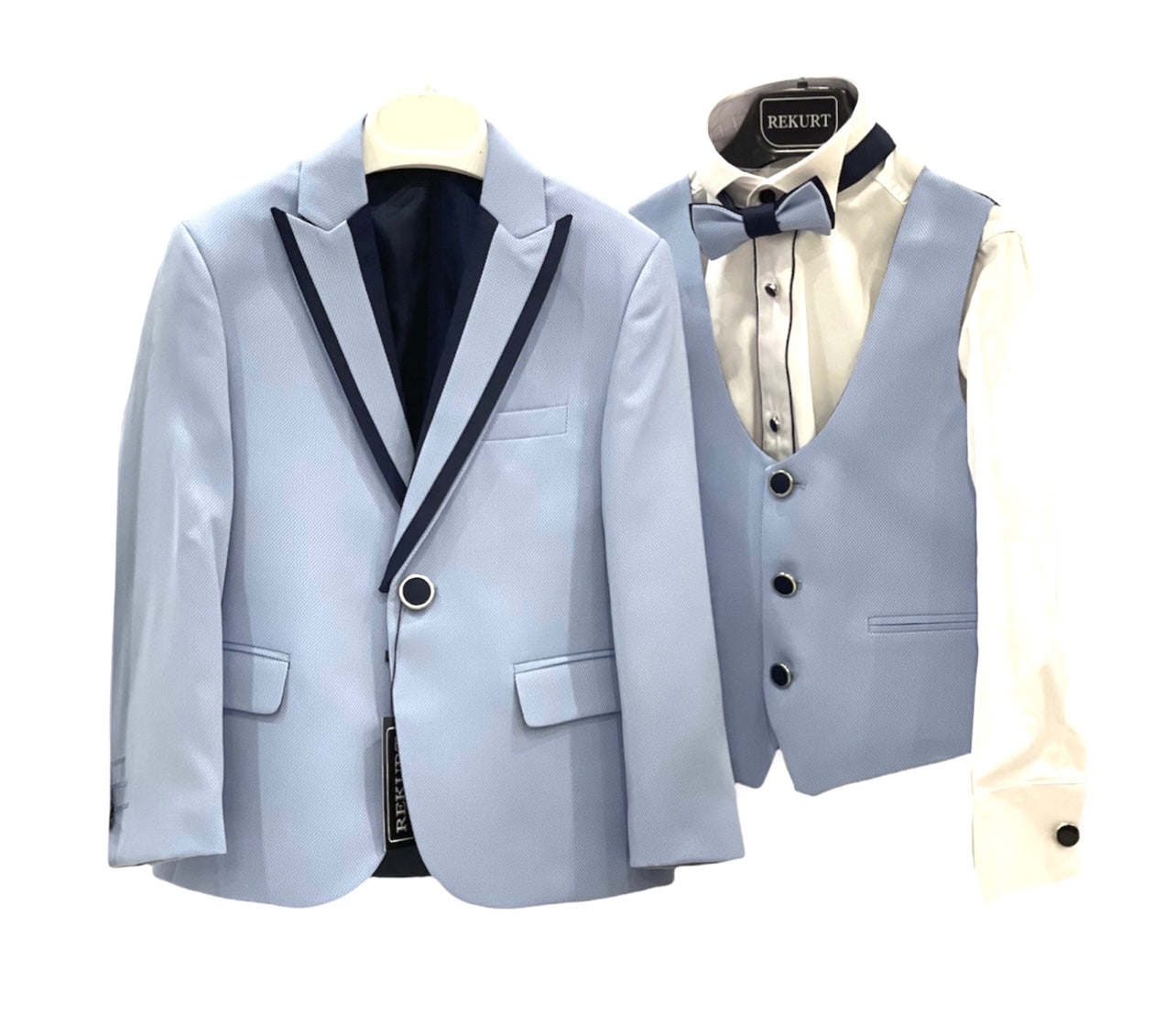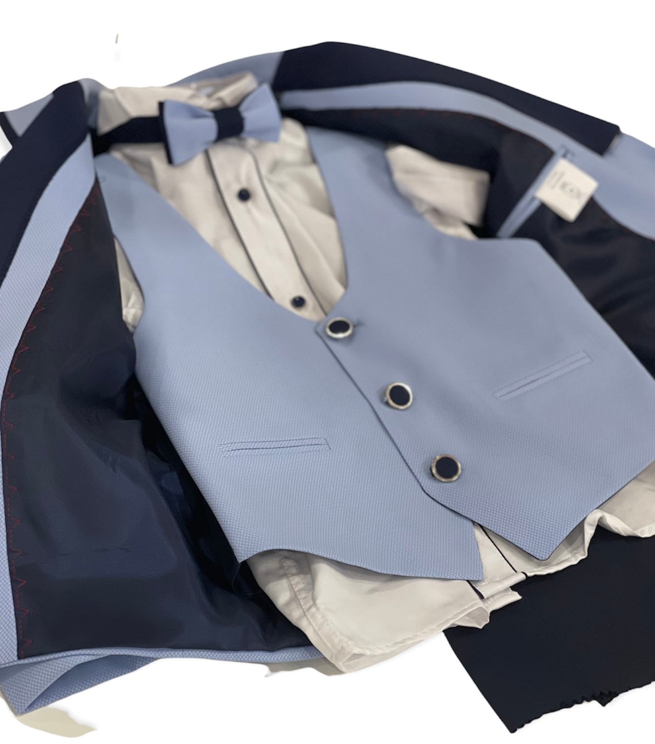 Abito da cerimonia maschile: Giacca, papillon, gilet, camicia e pantalone.