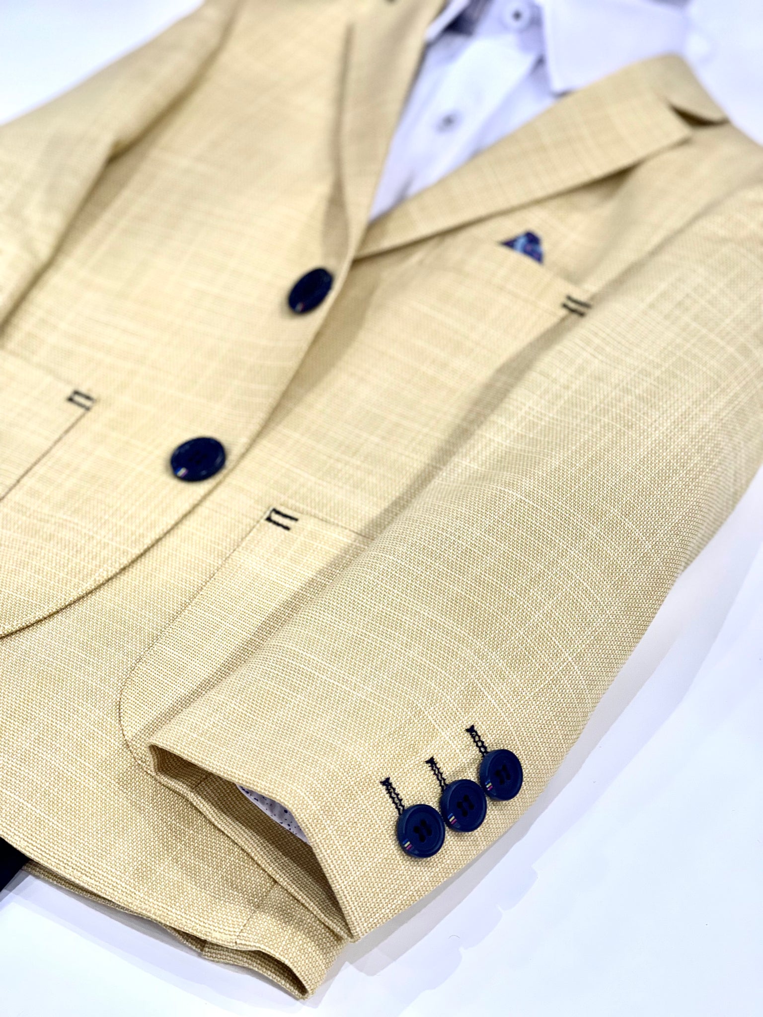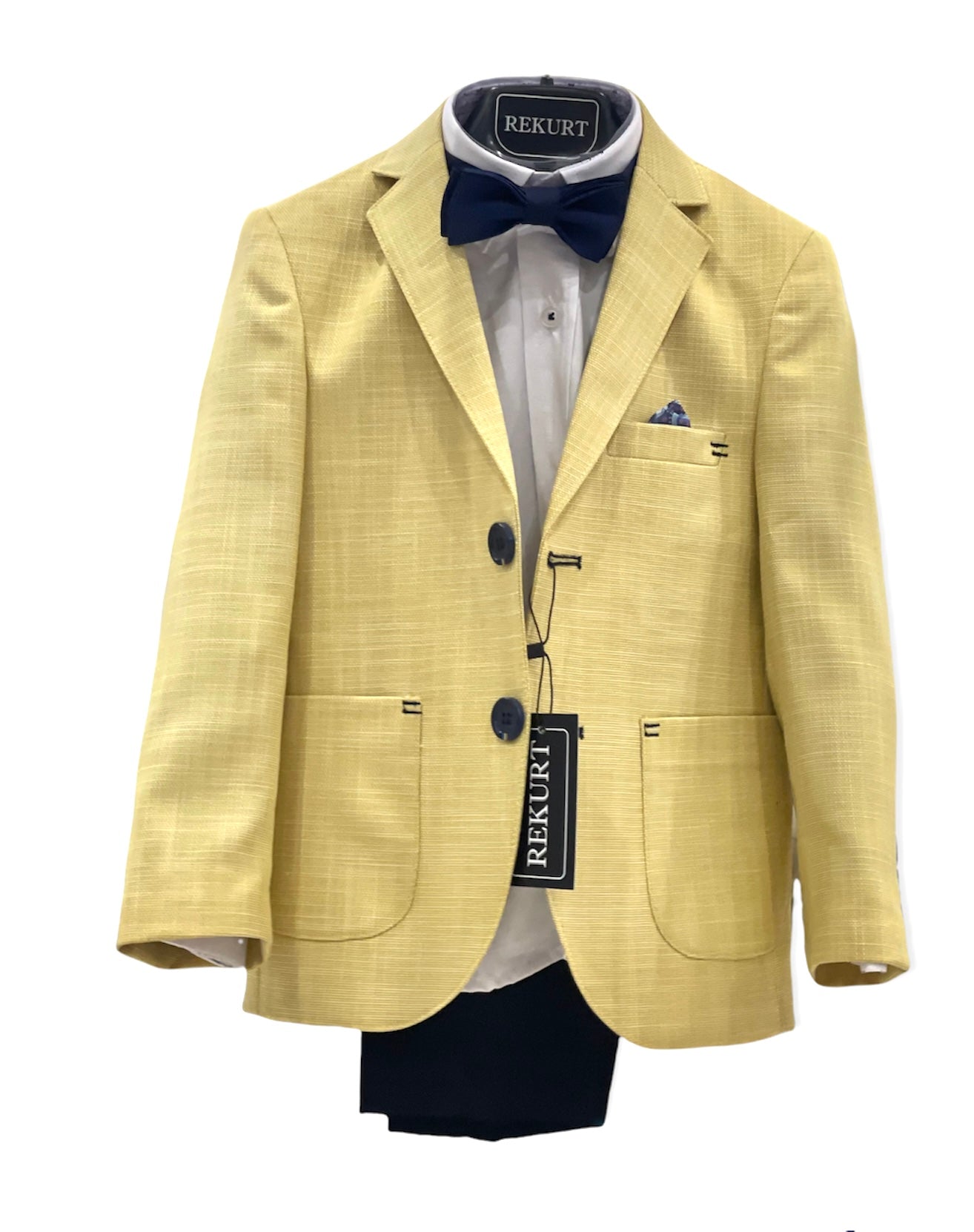 Abito maschile: giacca gialla con fazzoletto nel taschino, papillon, camicia e pantalone blu.