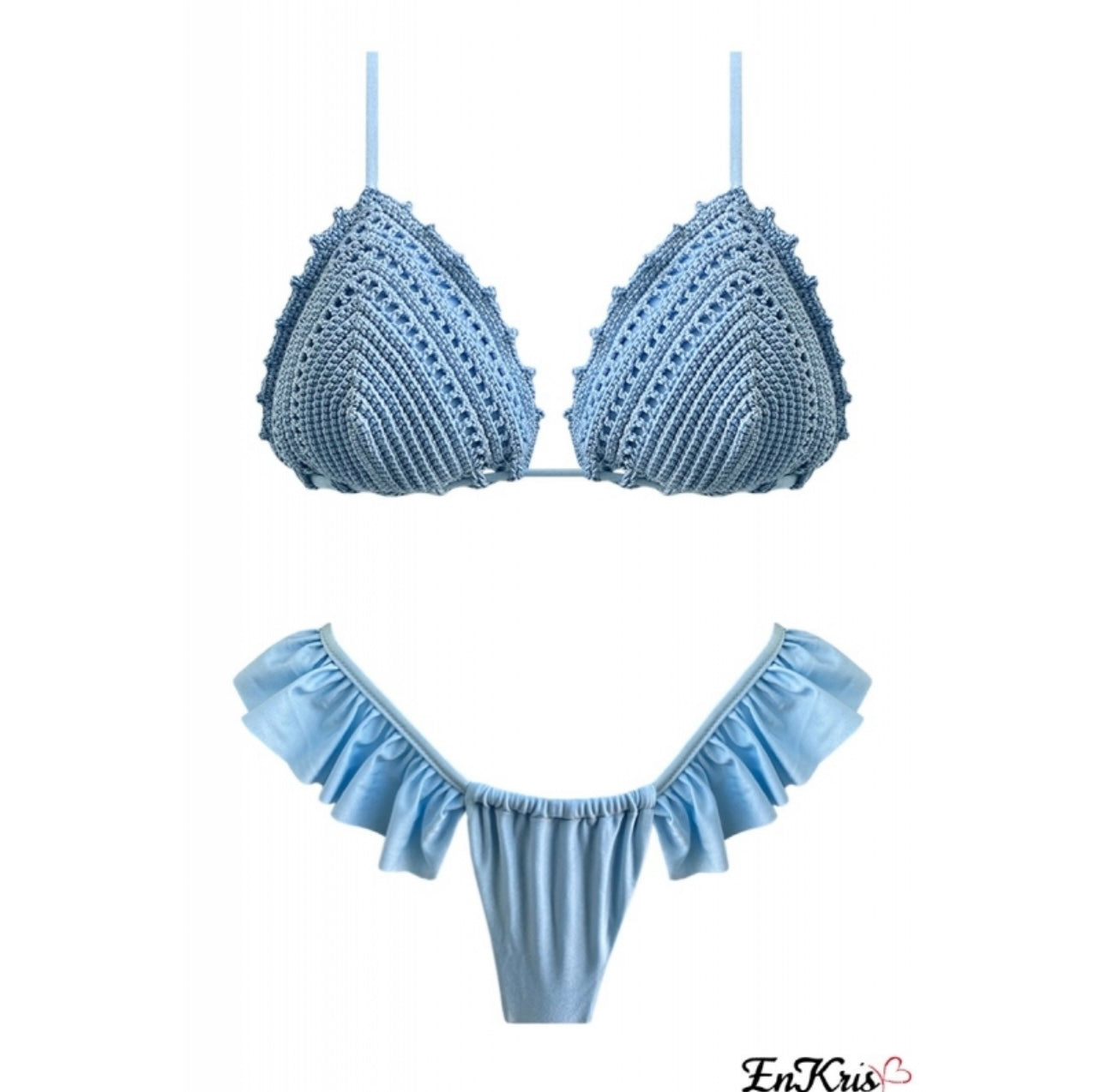 Triangolo artigianale con coppe preformate estraibili. Lavorato a mano mediante tecnica all’uncinetto in filato a tinta unita. Laccio di chiusura in lycra lucida.