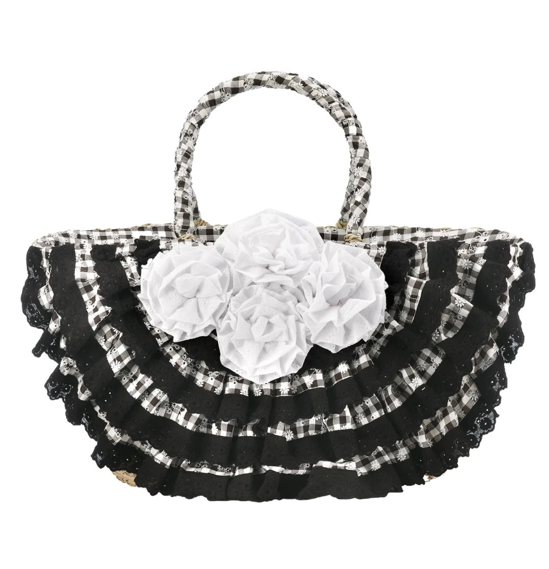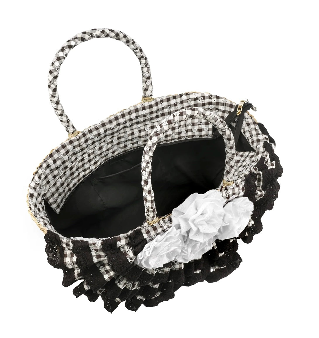Borsa Estiva in Paglia con Dettagli Chic: Design Elegante con Rouche in Pizzo Sangallo Nero e Vichy, Manico Coordinato e Delicate Rose Bianche in Pizzo. Rivestimento Interno Raffinato in Tessuto Vichy, Logo Impresso su Eco-Pelle di Alta Qualità, e Pratica Tasca Interna. Un Accessorio di Stile che Unisce la Funzionalità alla Raffinatezza, Perfetto per Aggiungere un Tocco di Eleganza ai Tuoi Outfit Estivi. Designed in Florence with Love