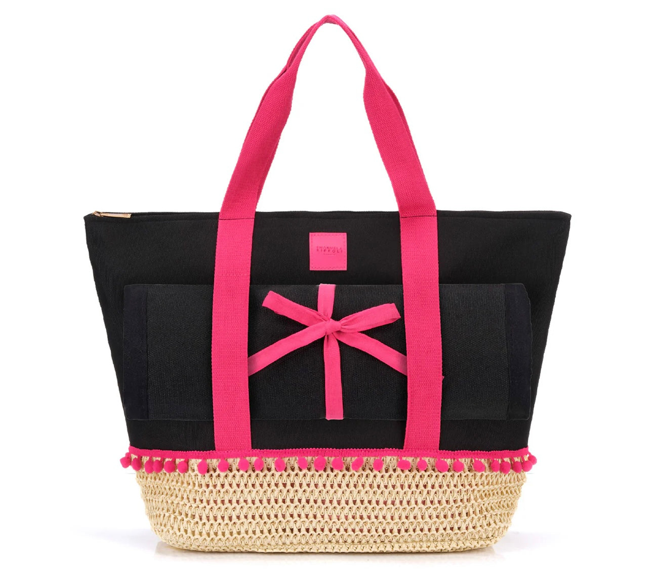 Borsa Tote Fucsia in paglia naturale e tessuto con stuoia in paglia naturale. Decorazione pom pon. Chiusura a zip, fodera interna, tre tasche, una con zip. Stuoia inserita esternamente.