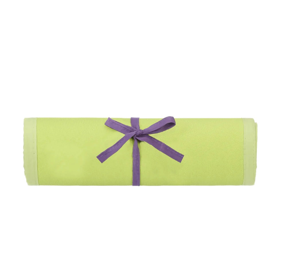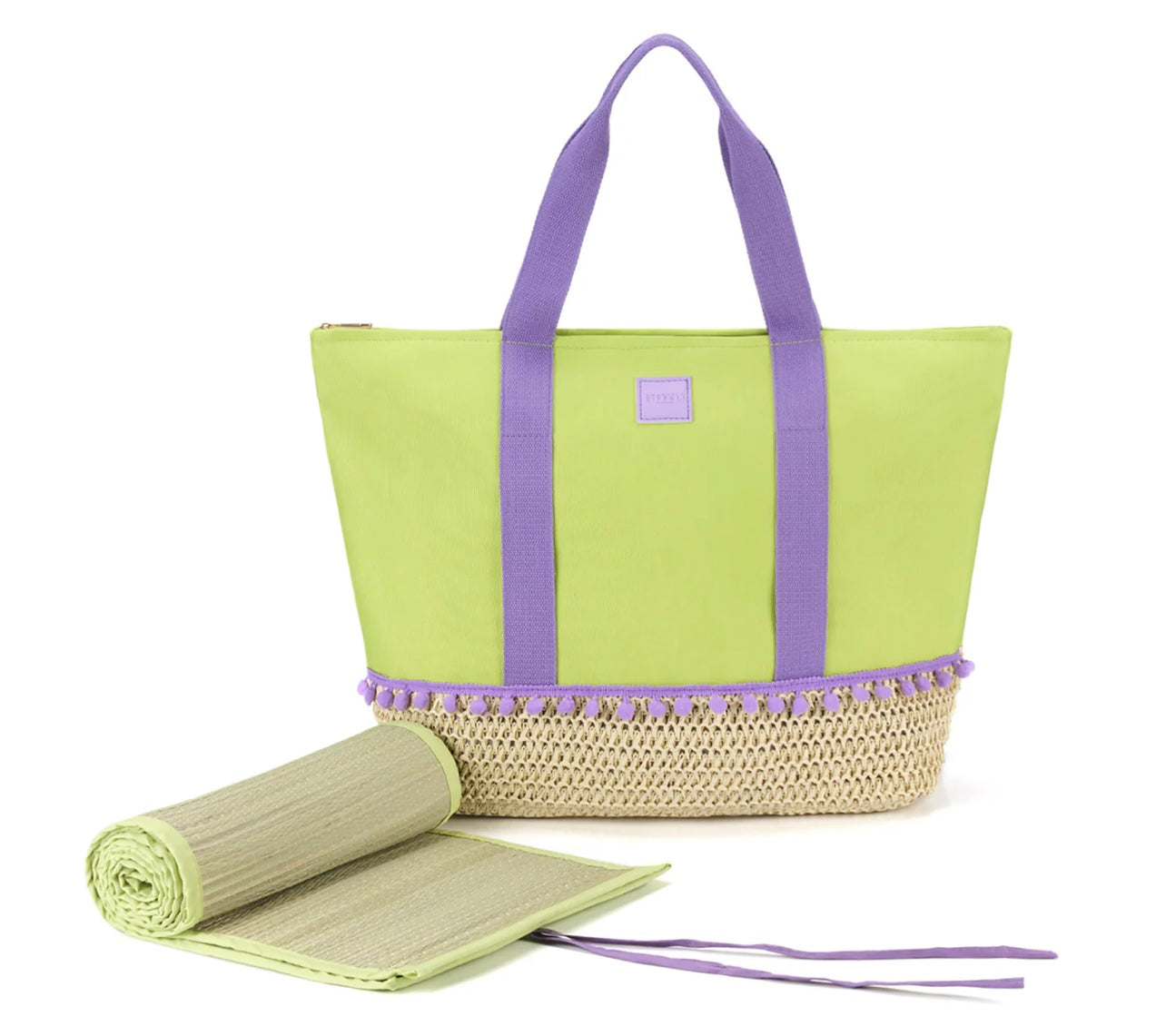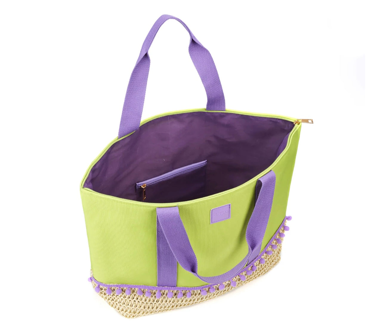 Borsa Tote Lime in paglia naturale e tessuto con stuoia in paglia naturale. Decorazione pom pon. Chiusura a zip, fodera interna, tre tasche, una con zip. Stuoia inserita esternamente.
