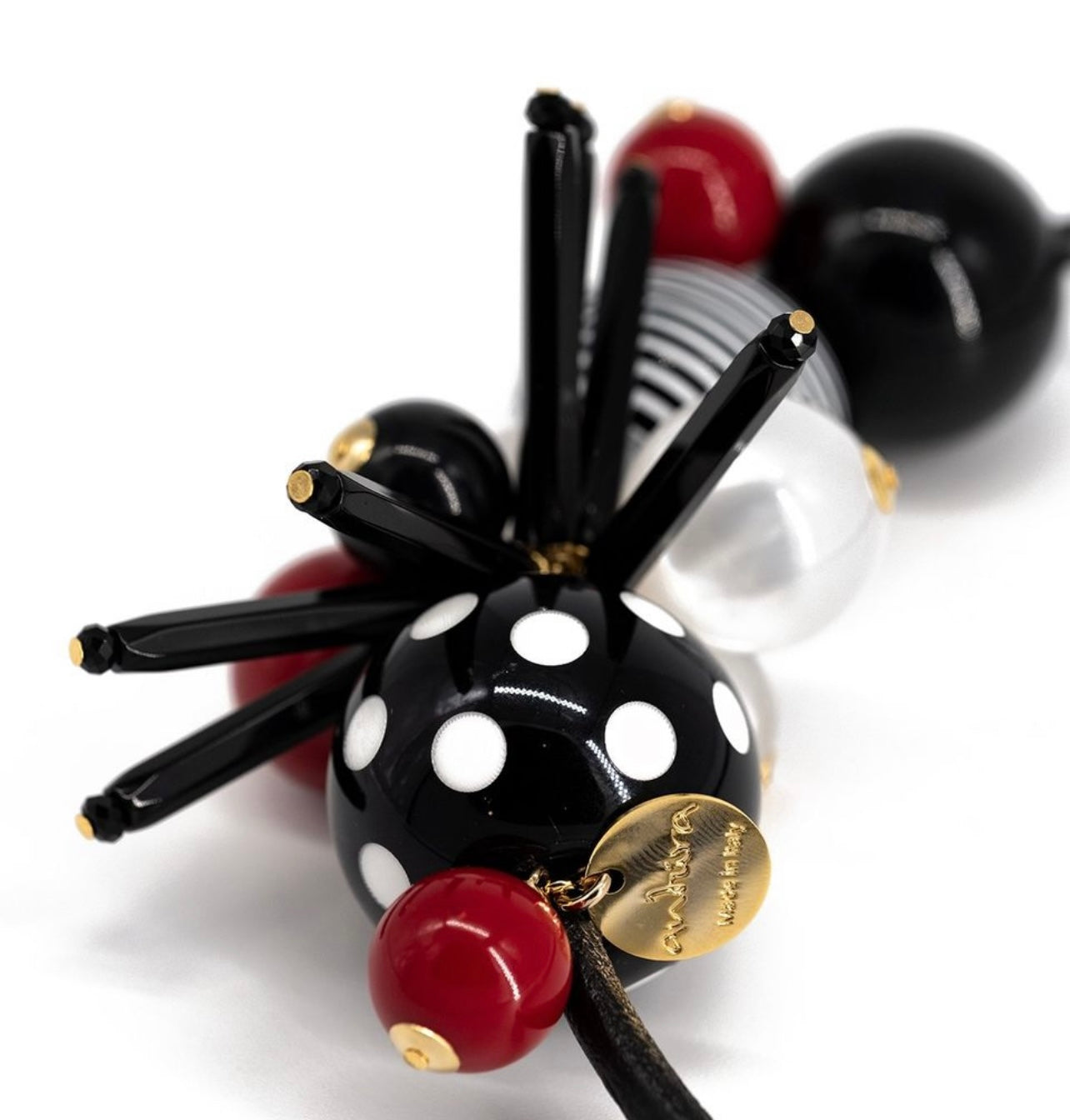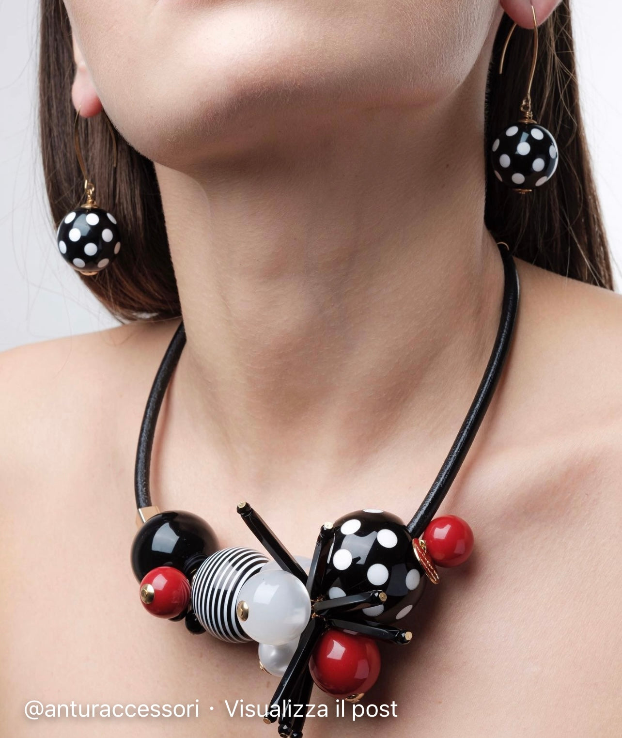 Collana Iconica Antura. Design Originale Creato da un Mix e Sovrapposizione di Elementi in cui Prevale la Maxi Sfera Pois Bianco e Nero Realizzata con Tecnologia Laser.