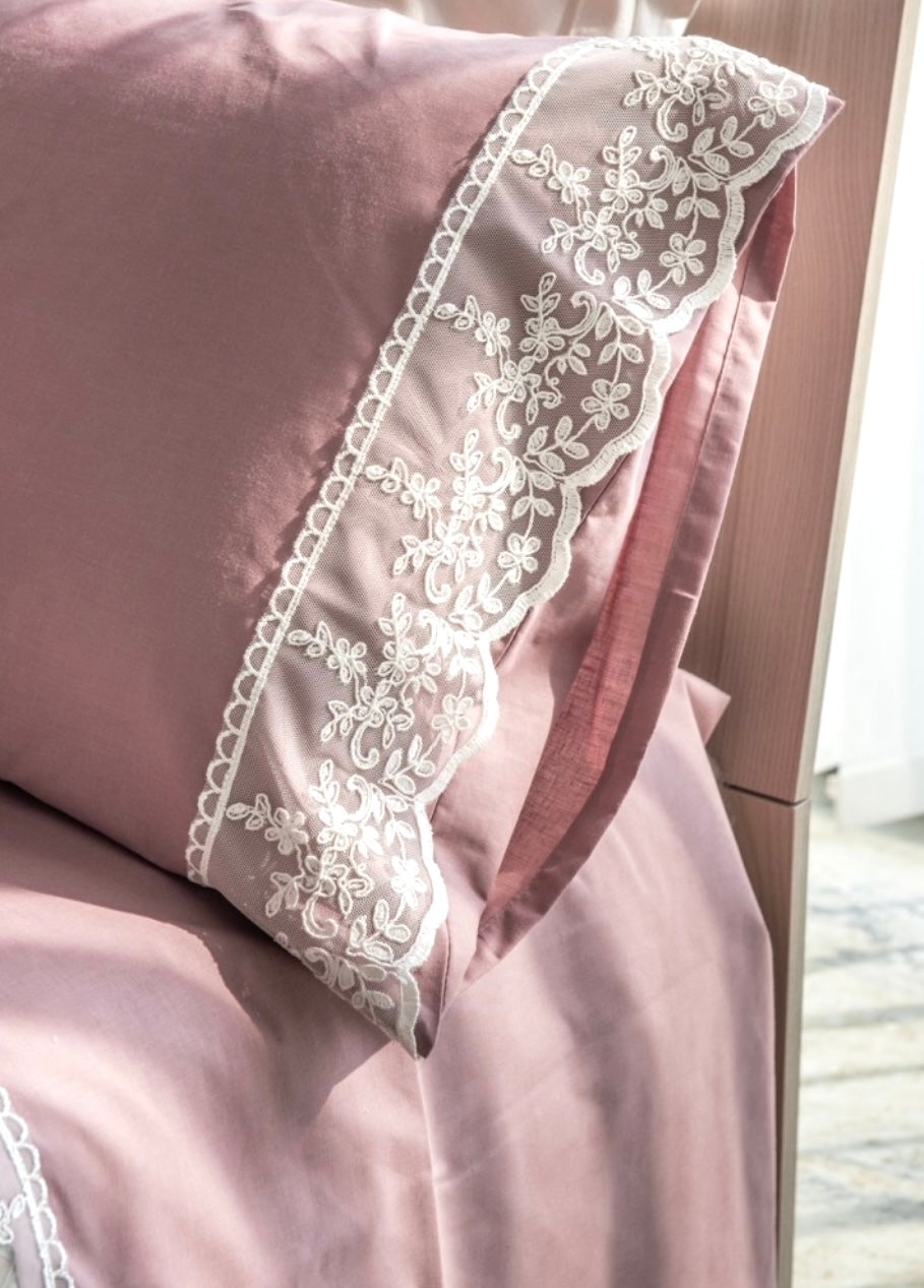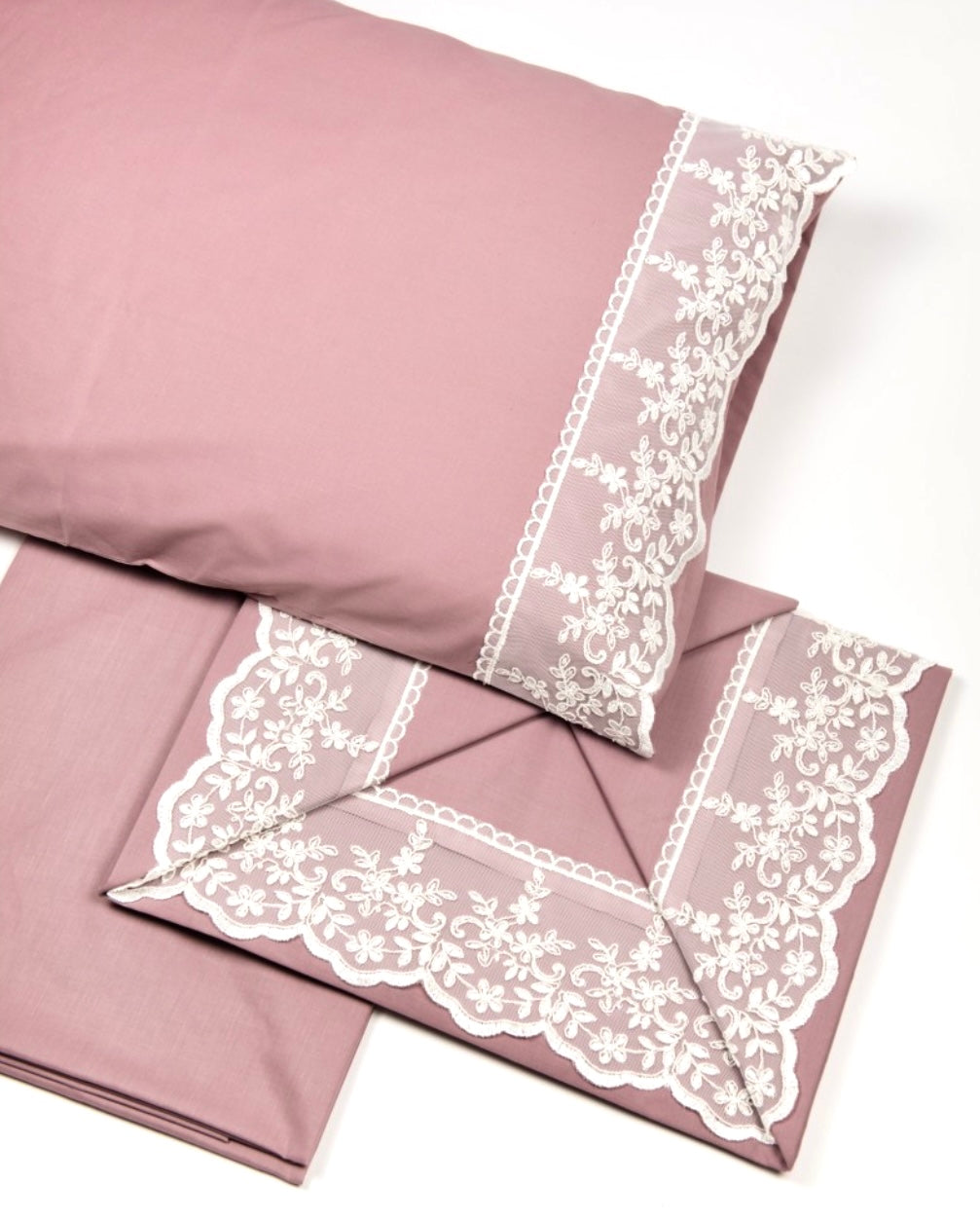 Completo Lenzuola Elegance Malva Matrimoniale con Bordo In Pizzo 100% Cotone
