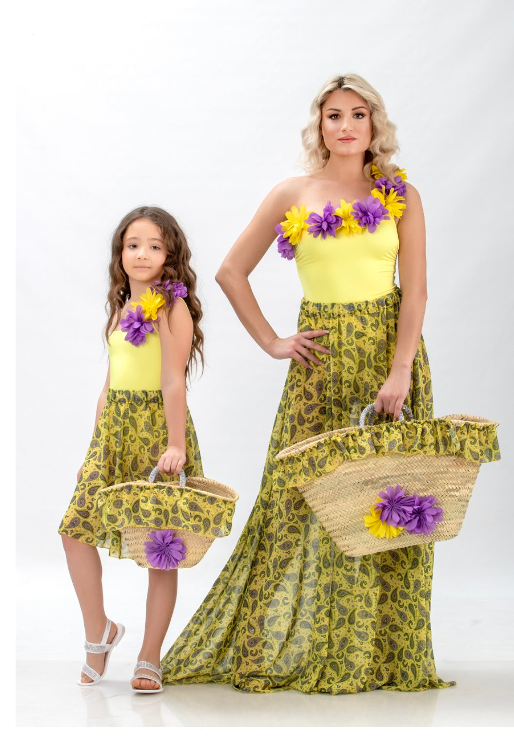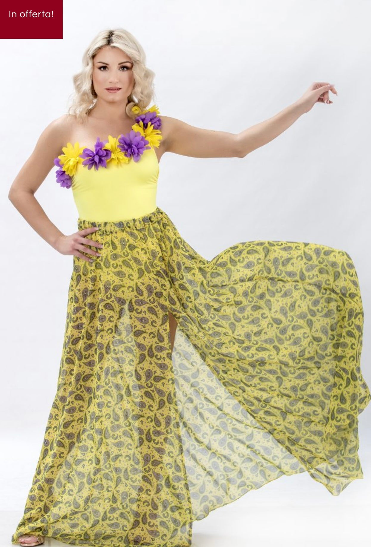 Raffinate, confortevoli e coordinate. In chiffon giallo stampato con dettagli viola e logato. Per un look esclusivo da mattina a sera