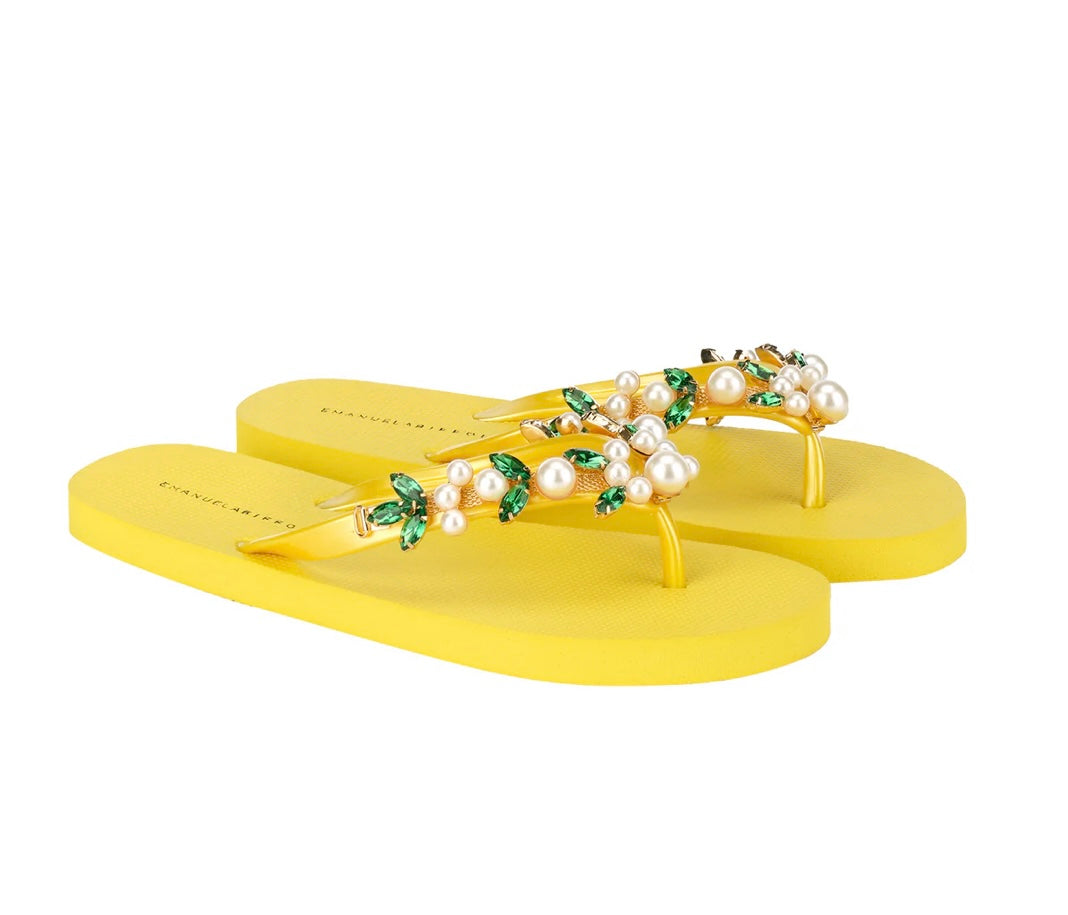 Scopri l'eleganza estiva con gli Infradito impreziositi da pietre decorative in varie sfumature di giallo, applicate sulla tomaia. La suola gialla in PE completa l'aspetto, offrendo un tocco di freschezza e comfort ai tuoi passi.