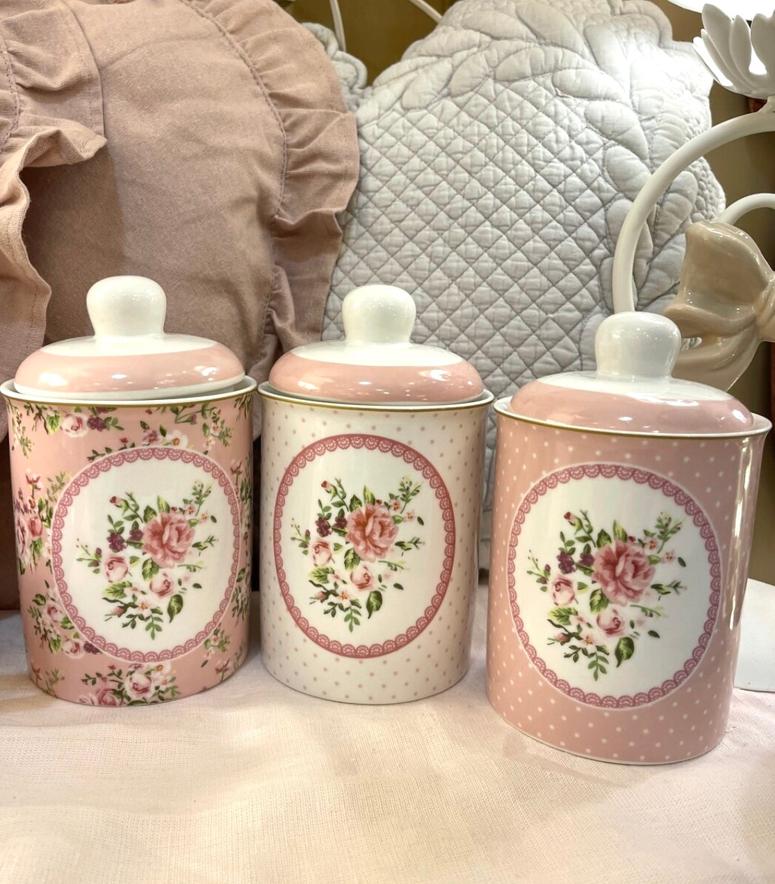 L'ARTE DI NACCHI SET 3 BARATTOLI CONTENITORI A FIORI CERAMICA ROSA 010,5 H16CM