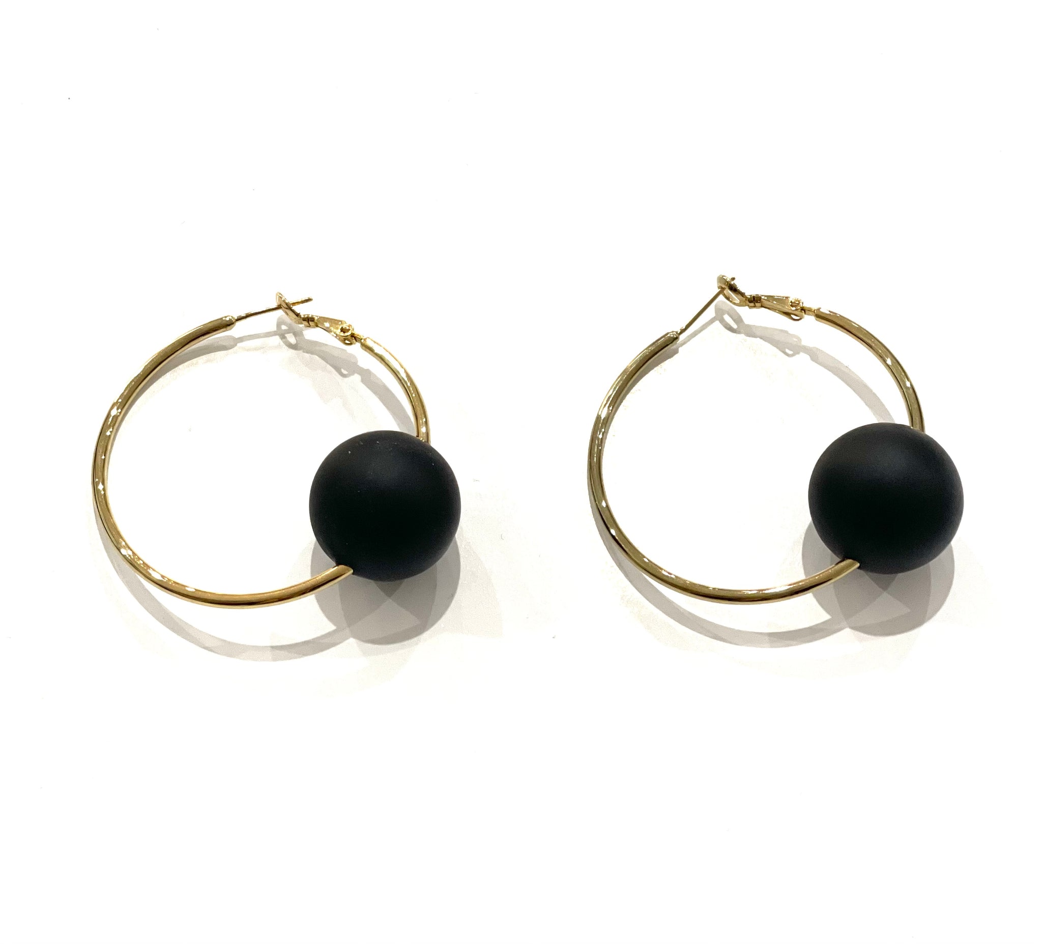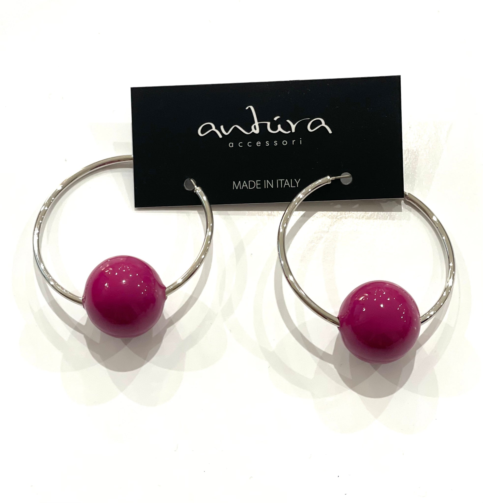 Orecchini a cerchio con elemento a sfera. Verniciatura opaca. Metalli galvanizzati e protetti anallergicamente.