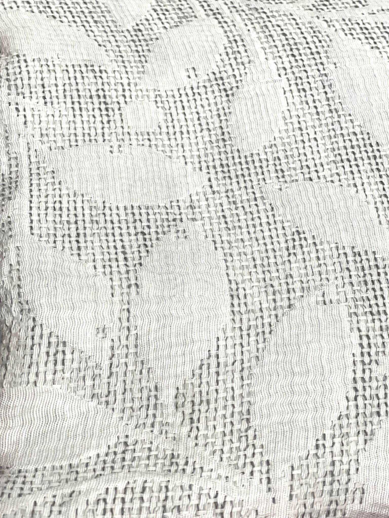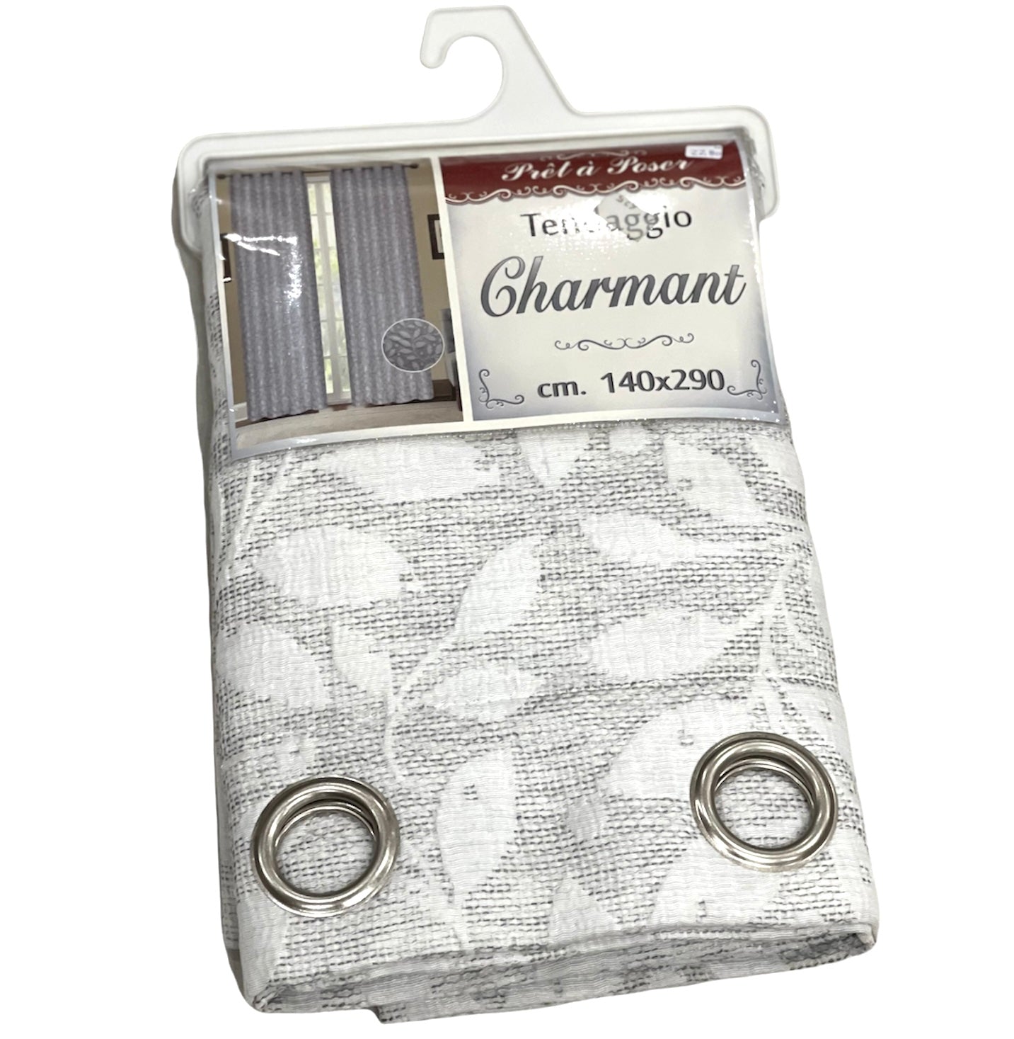 Tenda con anelli bianca e grigia con foglie