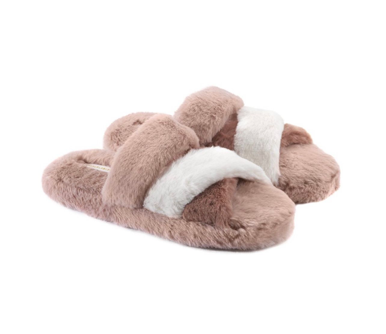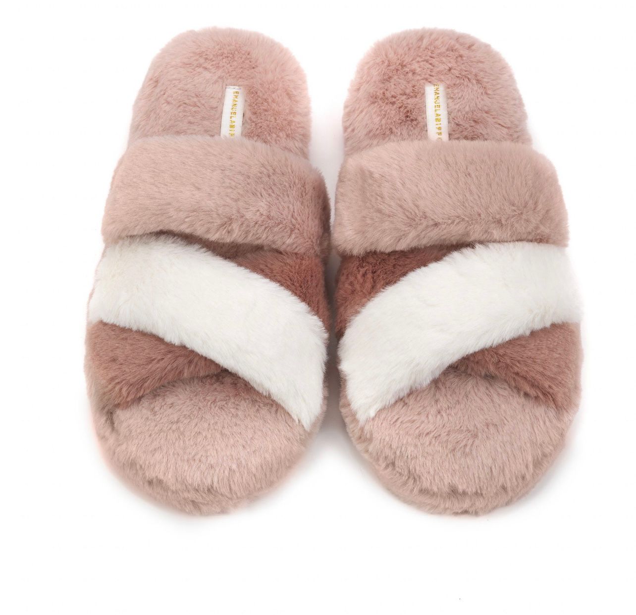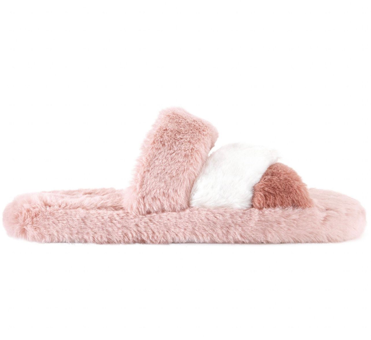 Ciabattina con tre fasce intrecciate in ecofur sulle tonalità del rosa e del bianco. Confortevole e calda grazie al rivestimento della suola in morbida ecopelliccia.