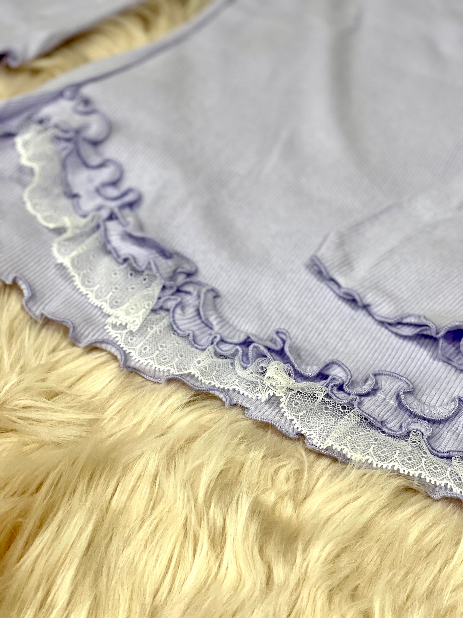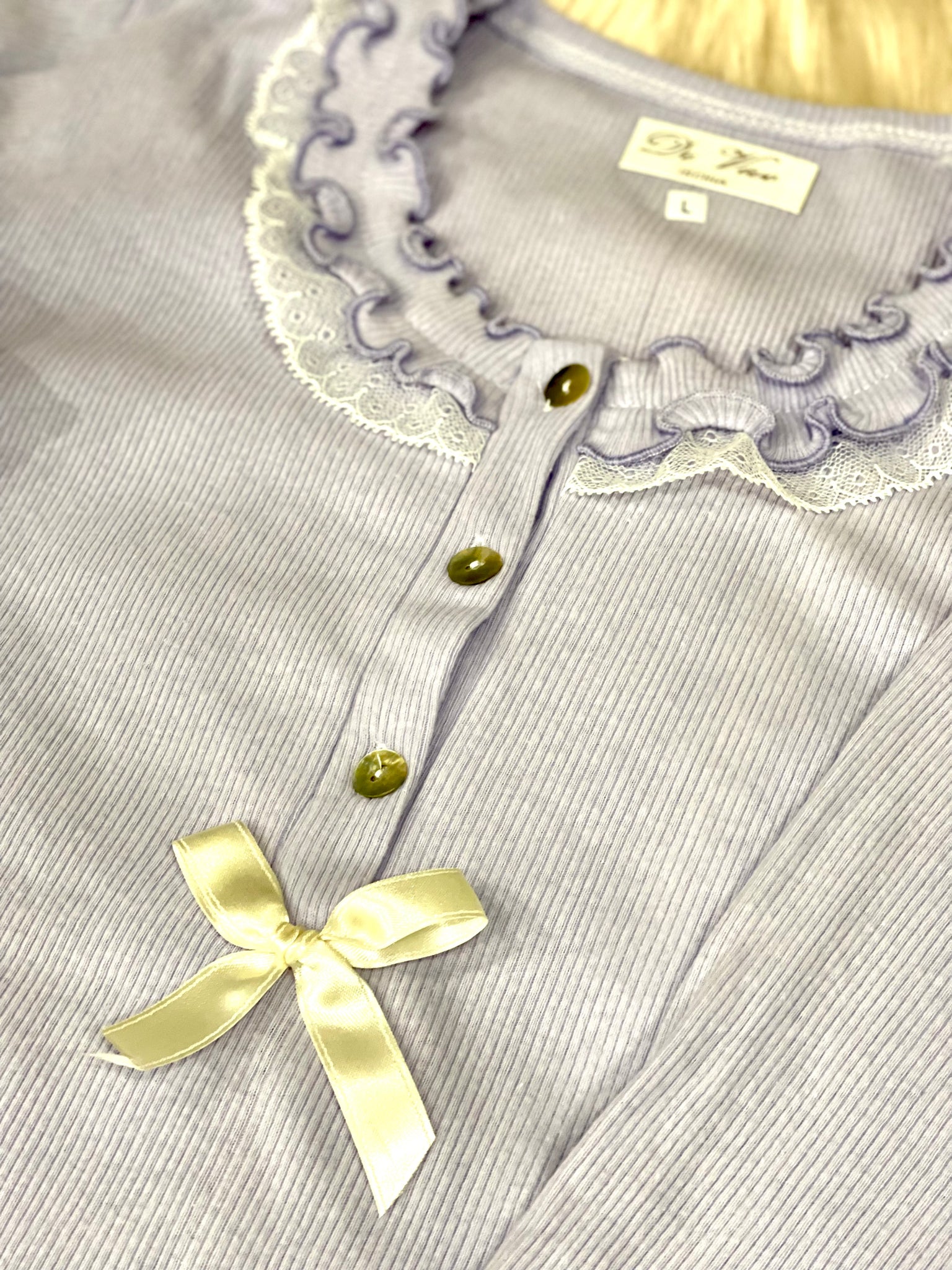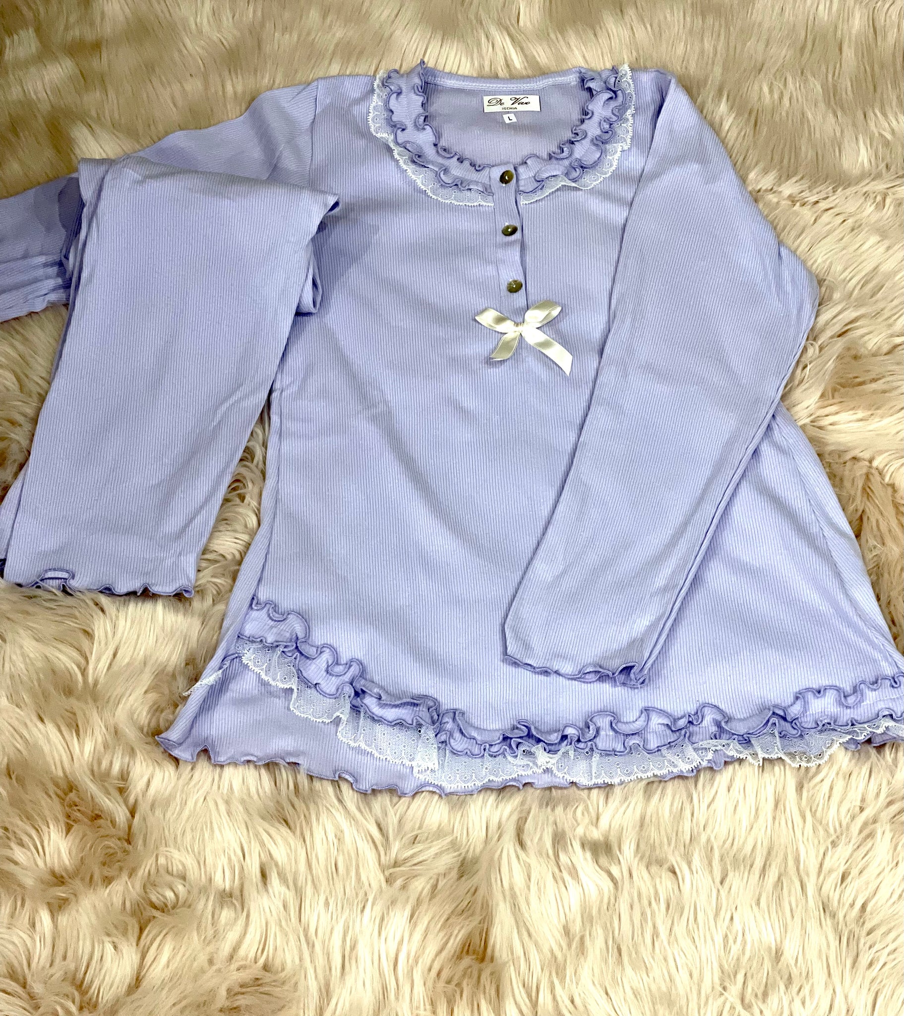 Pigiama in lilla con fiocco in raso bianco e pizzo in cotone artigianale..