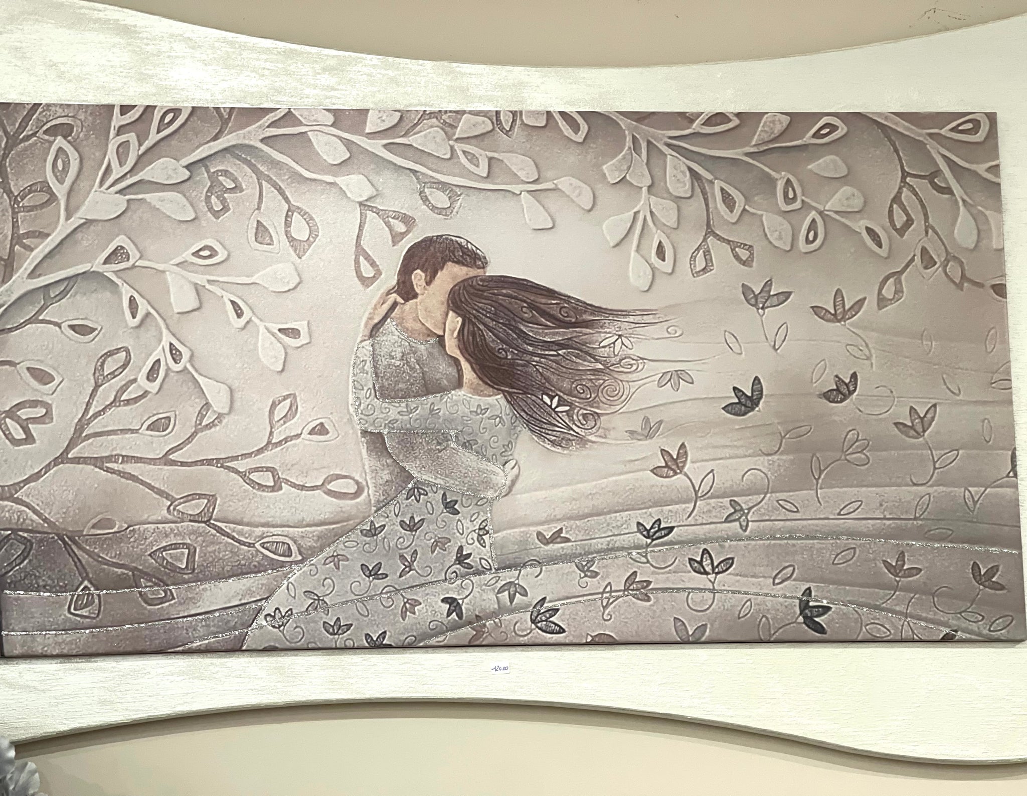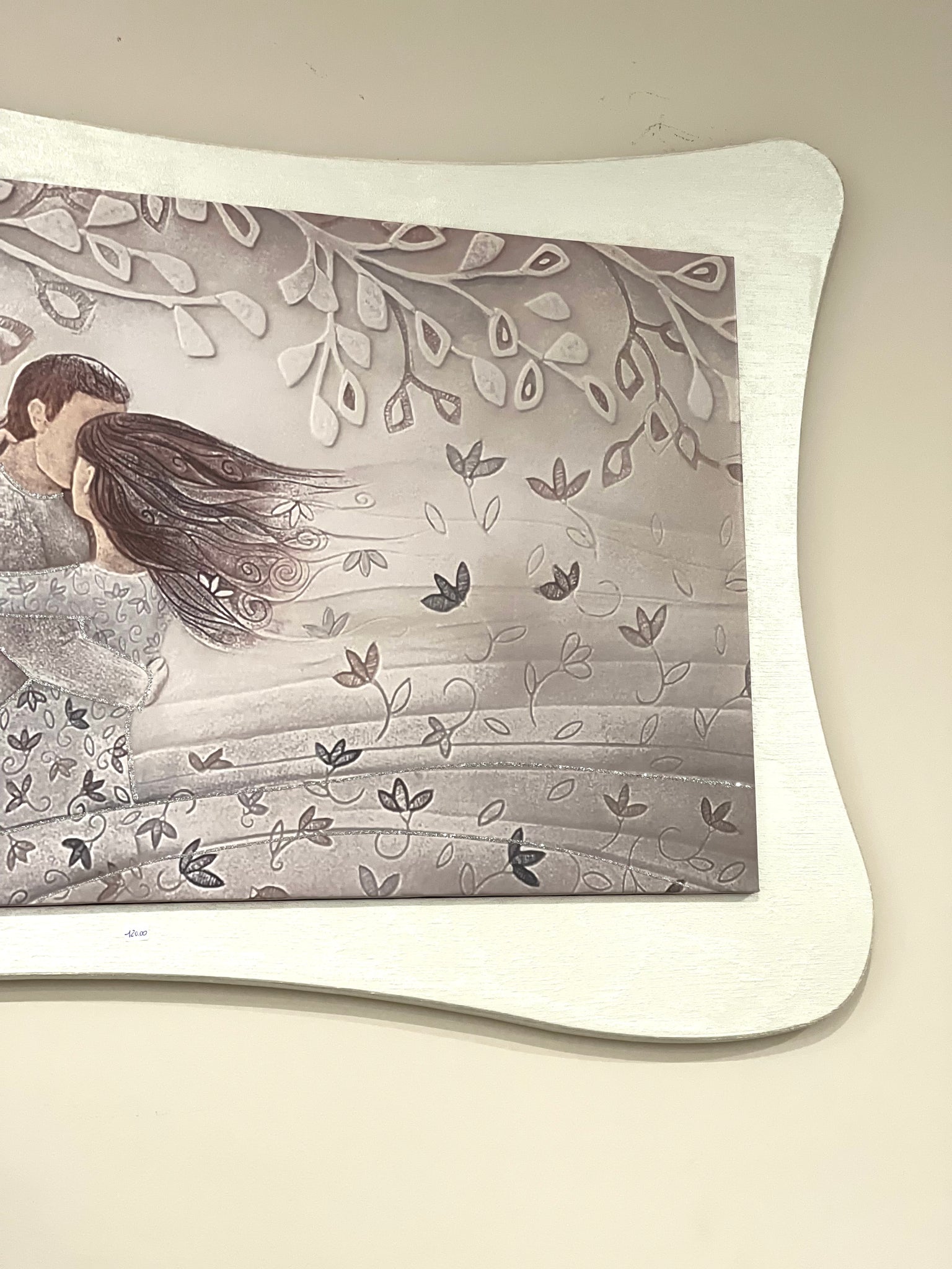 Quadro con albero della vita e coppia nei toni del grigio con dettagli brillantinati e cornice argento.