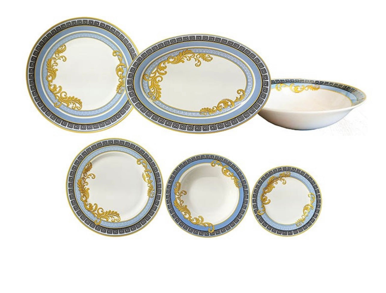 Primo servizio di piatti elegante per 12 persone con pezzi da portata, forma tonda in fine porcellana new bone china con decori colore azzurro, oro e nero applicati sottosmalto